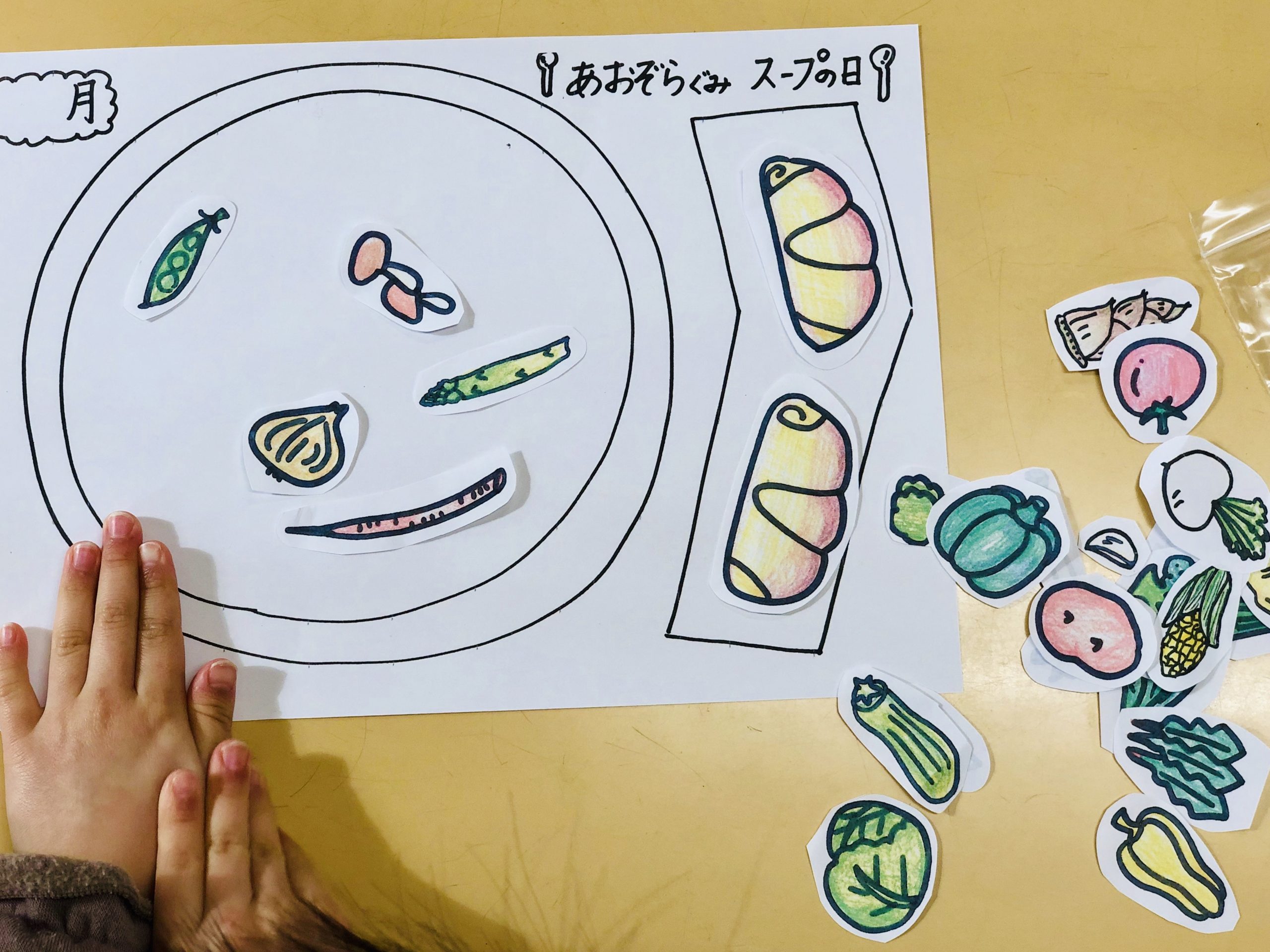 スープを食べ終わってひと休みしたら、「今日のスープには何が入っていたかな?」シートで振り返ります。たくさんある野菜のパーツから選んで貼り付けます。