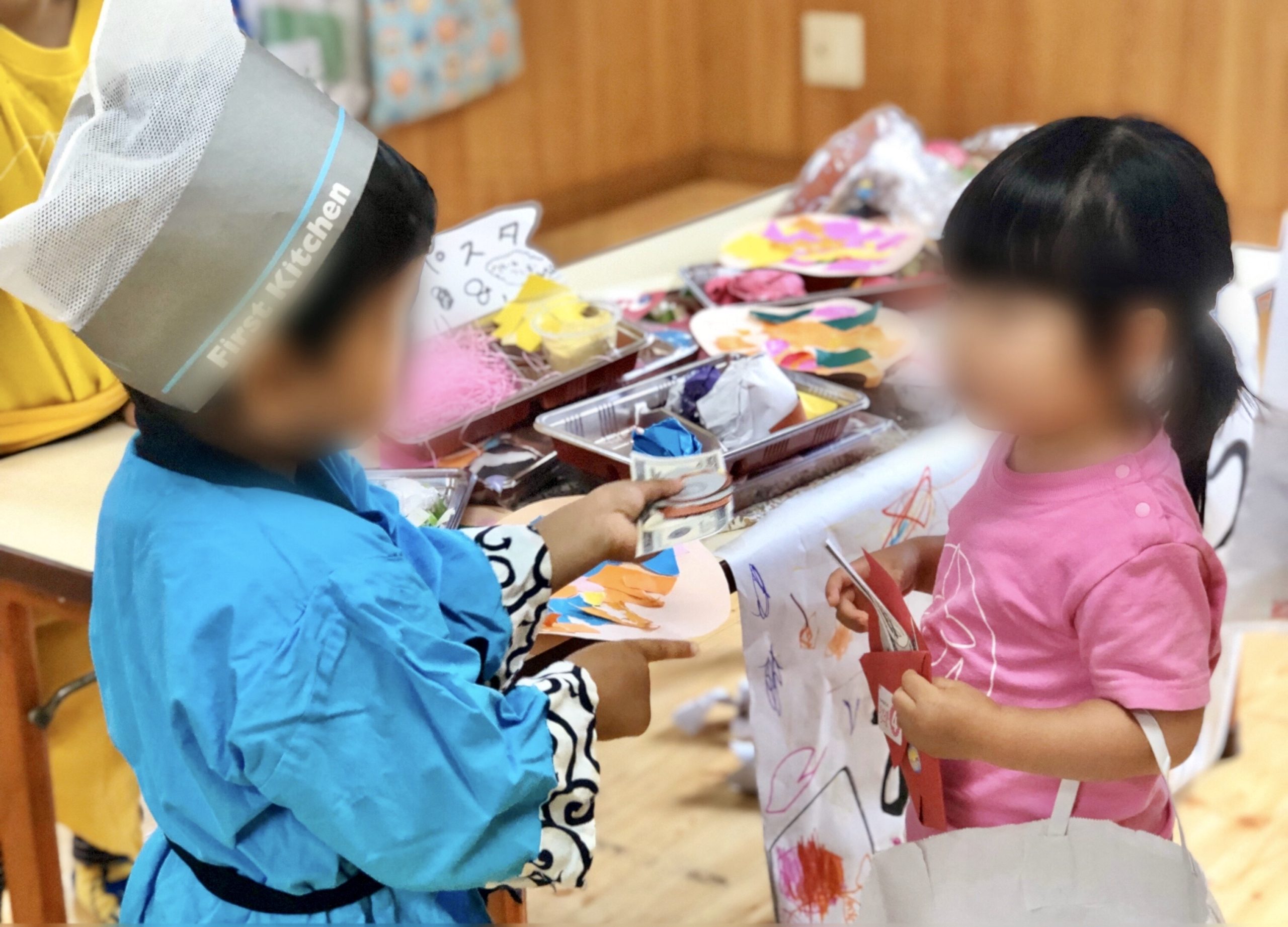 商品は全て子ども達の工作作品。子どもたちと親御さんがお客さん。年少からは店員さんとして働きます。